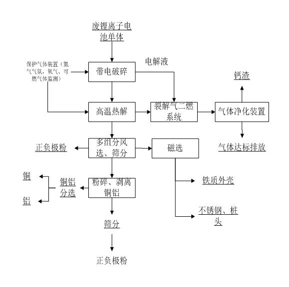 廢舊鋰電池單體破碎分選技術(shù)工藝流程整體工藝采用單體帶電的鋰電池破碎、高溫?zé)峤狻⒍嘟M分篩分分選、銅鋁分選工藝,各組分物料回收率可達(dá)95%以上,極粉純度達(dá)95%-98%。該流程生產(chǎn)線可以處理三元?jiǎng)恿︿囯姵丶傲姿徼F鋰電池,通過物理分選方法,實(shí)現(xiàn)鋰電池有價(jià)金屬高效回收,產(chǎn)品為廢舊鋰電池中的樁頭、外殼、正負(fù)極集流體、正負(fù)極粉材料。