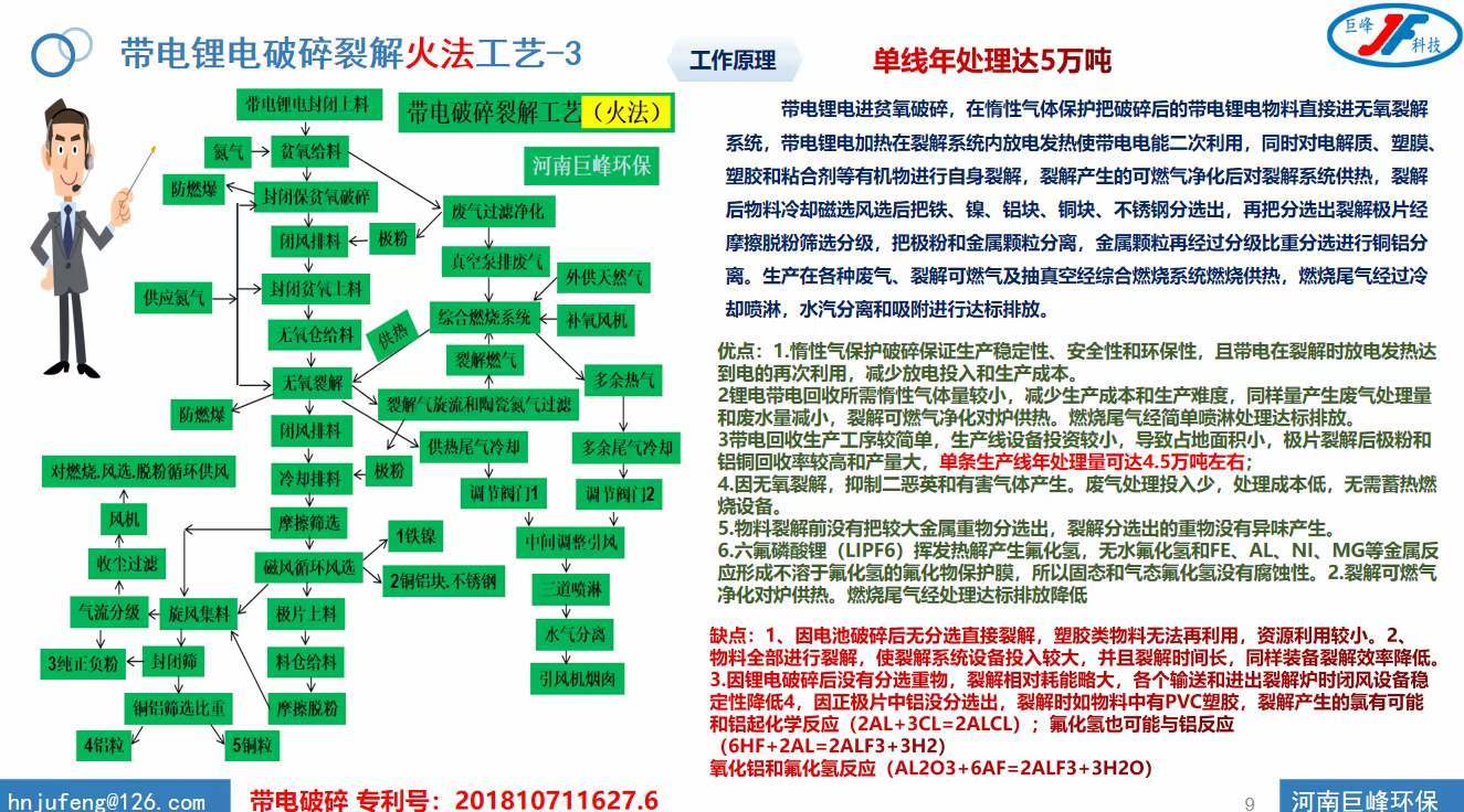 6.六氟磷酸鋰(LIPF6) 揮發(fā)熱解產(chǎn)生氟化氫,無水氟化氫和FE、AL. NI、MG等金屬反應(yīng)形成不溶于氟化氫的氟化物保護(hù)膜,所以固態(tài)和氣態(tài)氟化氫沒有腐蝕性。裂解可燃?xì)鈨艋瘜?duì)爐供熱。燃燒尾氣經(jīng)處理達(dá)標(biāo)排放降低