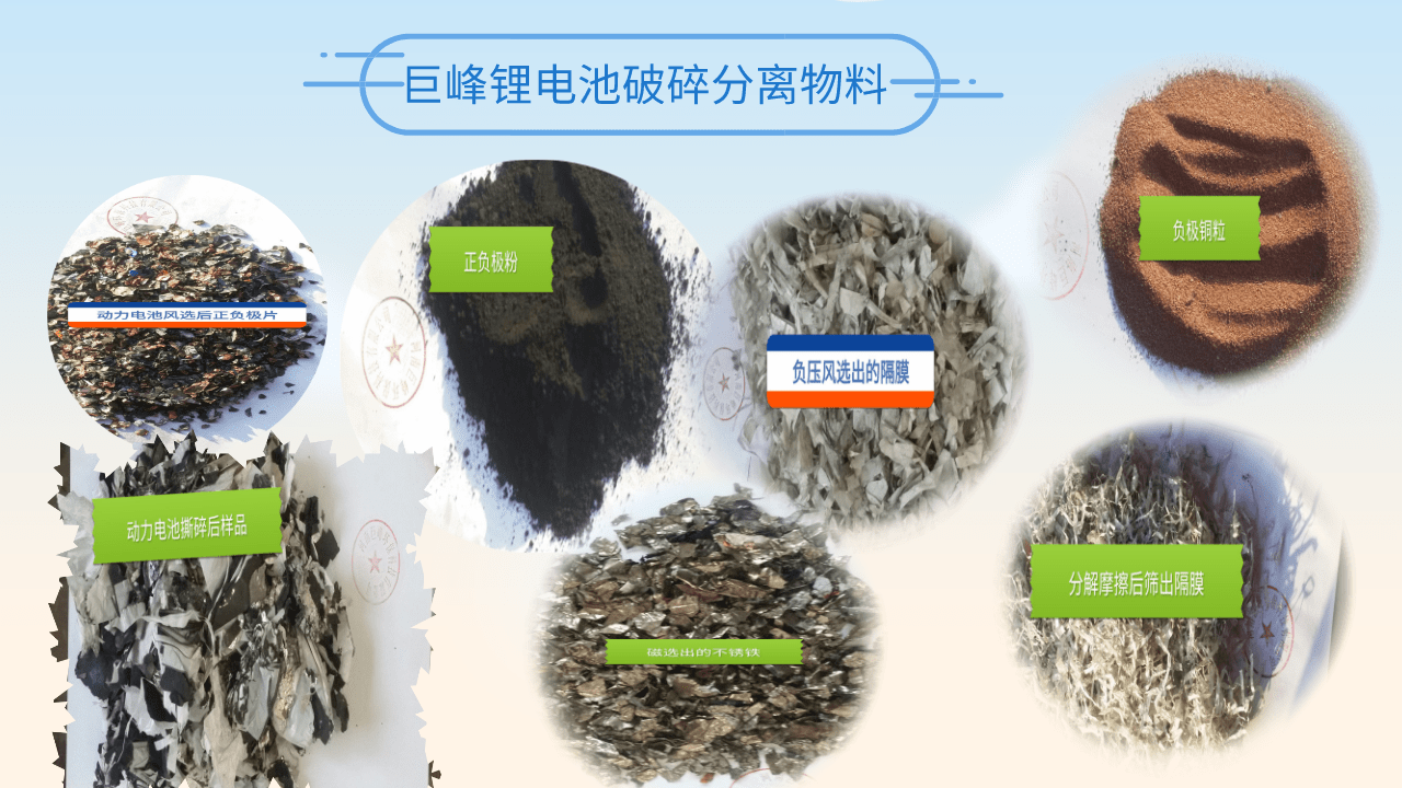 1)用途:1.將帶電的廢舊電池芯,正極片經(jīng)過剪切破碎。碎電芯與廢三元類正極片一起經(jīng)過高溫?zé)峤狻⒎诌x、剝離等處理工序分離出正負(fù)極粉、鋁片、銅片、外殼。