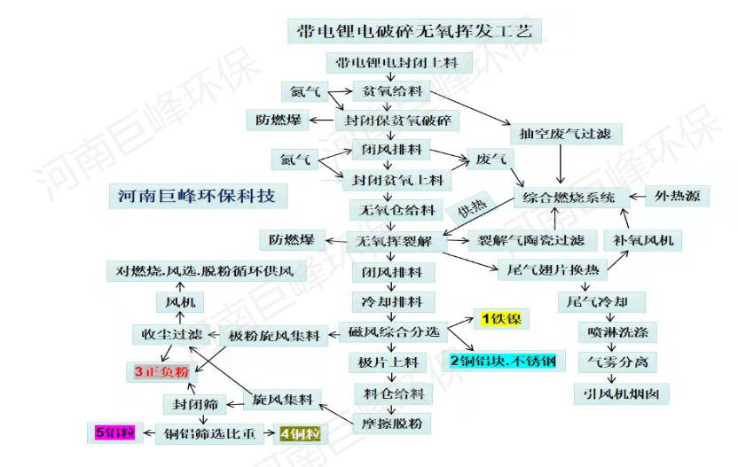 廢電池處理破碎回收工藝分為廢舊鋰電池的上料,貧氧破碎,無氧裂解,分選,摩擦脫粉篩,廢氣綜合利用,廢氣處理凈化等,尾氣處理采用高溫燃燒方式進(jìn)行處理,符合環(huán)保排放要求,尾氣燃燒后的熱量跟二次利用。設(shè)備為可平放,可移動式,無需打地基。可燃?xì)赓Y源化利用率高。設(shè)備設(shè)有雙氮?dú)獗卮胧┖头辣到y(tǒng),防止爆炸爆燃的發(fā)生。鋰電池回收設(shè)備每小時(shí)可處理1.3-1.6噸左右?guī)щ婁囯姵亍?/span>